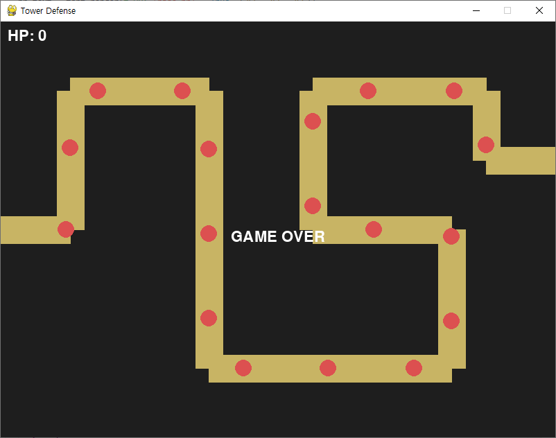 HP가 0 이하가 되면 게임 오버 문구를 띄우고, 스폰을 멈춥니다.